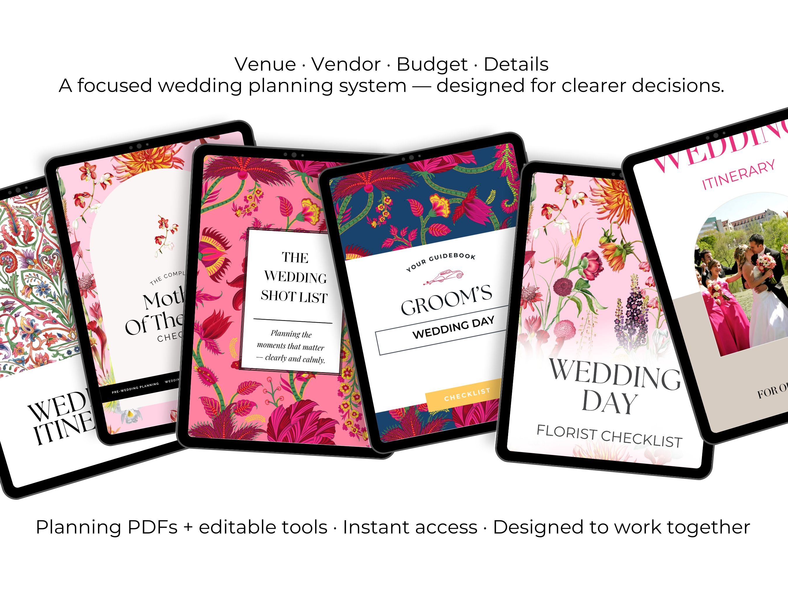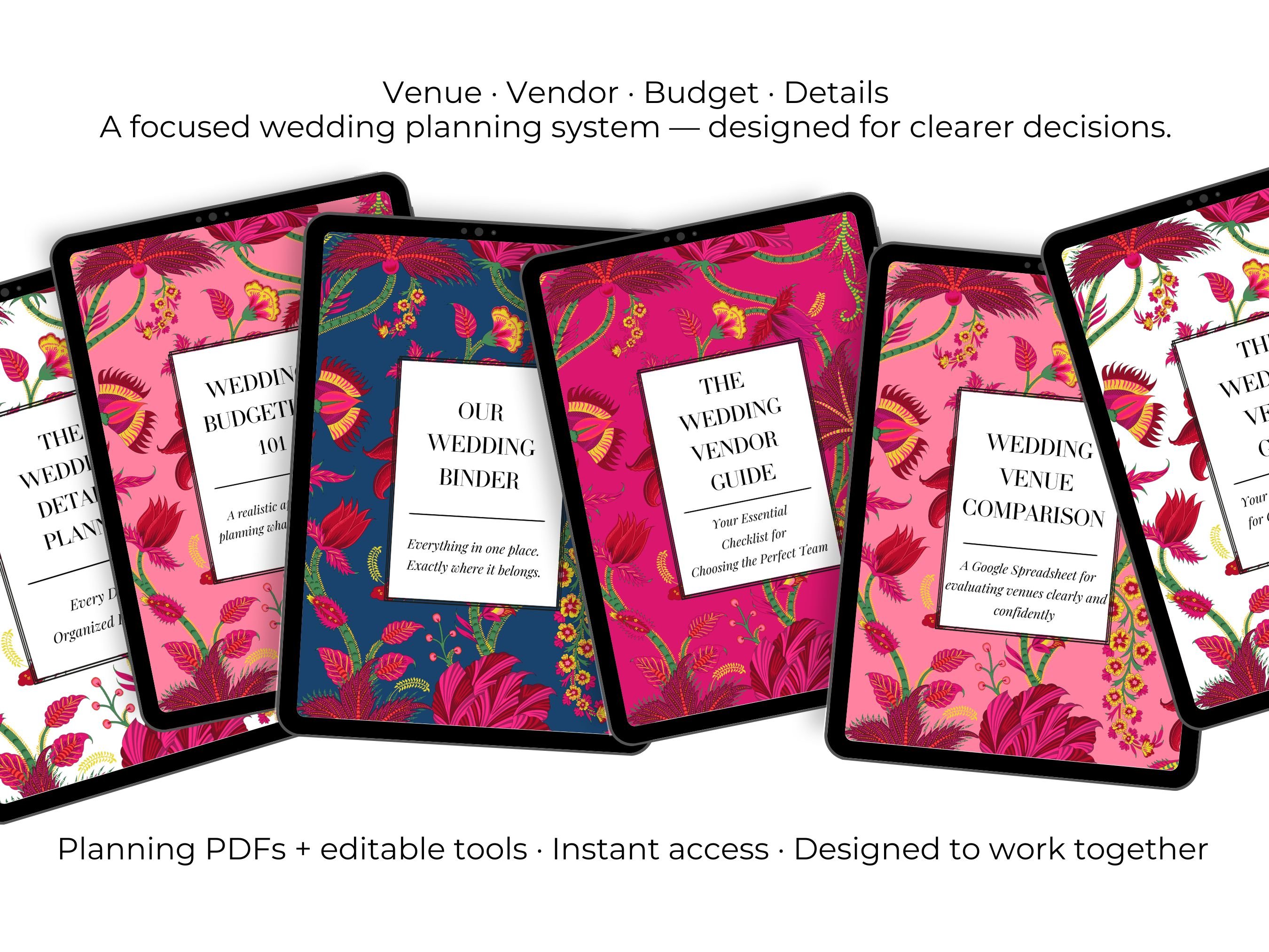 The Wedding Suite™ — At a Glance A beautifully organized planning system that replaces overwhelm with clarity, confidence, and intention. Inside, you’ll find: A complete planning framework that guides you from first decision to final detail. Editorial-quality worksheets for budgeting, priorities, tone, mood, and storytelling. Decision tools that make choosing venues, vendors, timelines, and logistics effortless. People-management guides for roles, expectations, harmony, and communication. Destination-ready resources for travel, timing, and place-driven celebrations. Fillable PDFs, editable spreadsheets, and Canva templates — all beautifully designed. A curated folder system + Welcome Pack so everything feels accessible, calm, and intuitive. This is planning without panic. Design without noise. Your wedding — clarified, elevated, and beautifully orchestrated.
